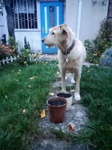 A kertben, mikor kihoztam a kis kerti házból a fekete aranyat, Szofi önkéntes őrzője lett, nyilván tudta, milyen értékes kincs, míg én bíbelődtem a levendula metszéssel: