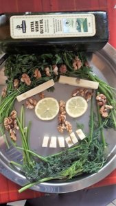 A másik nagy kedvencem a kapor pesto. Mert úgy a legfinomabb, nyersen, frissen. Mellépattintottam a 3 csokor kaporhoz kettő petrezselymet is. Olíva olajat jócskán, kis citromlét, szárszói diót, parmezánt és eidami sajtot, sót, pici borsot.
