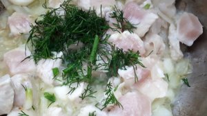 Először hagymát, fokhagymát és husit dinszteltem, majd beleugrott a kapor fele és egy kis peterzselyem.