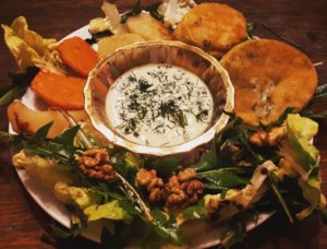 Mert míg a kertben végeztem a rengeteg tavaszi munkát, Laci elkészítette az ebédet, rántott tököt, medvehagymás camambert és csirkefalatokat tepsis krumplival, én mellé lőttem a tökmagolajos pitypangos, pirított diós salátámat, hát frenetikus volt!