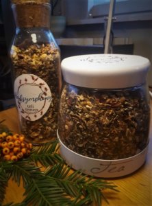Olyan teát kevertem az idei téli ünnepek idejére, ami kicsit más, mint a megszokott téli teák. De hát én is más vagyok. Hiperérzékeny és finom, cizelláltabb dolgokban tudok kinyújtózni. Meg a csendben. Nem szerettem volna mézeskalács illatú, ízű teát, mert azt eleve érzem, ha sütök a fiammal, nekem az bőven elég. Finom, kellemes, de intenzív, sok. A téli teámban a megnyugvást, kényeztetést, cirógatást keresem. Egy másik utat, ami nekem a tél és az ünnep. Olyat kevertem, aminek nemcsak a hatóanyagtartalma jótékony , de az ízek elvarázsolnak, beburkolnak és kirepítenek a téli rohanásból. Tegnap debütált nálam, olyan, amitől behunytam a szemem..Az akác és a jázmin íze felváltva simogat, a narancstól mosolygok, a pici gyömbér csiklandoz. Az alma átfűzi az egészet, íze olyan átfogó és finom, mint a pektin hatása. A hibiszkusz és rózsaszirmok megkoronázzák az egészet. Mindezek alaphangja a citromfű, aminek nemcsak hatása, de bájos íze is nyugalmat, békét áraszt. Természetesen csipkebogyóval fűszereztem, aminek nagy rajongója vagyok. Csodálatos ajándéka a természetnek. Nem is elégszem meg azzal, amit gyűjteni tudok, az új földön körbeültettem vele a kertet, rengeteg fajtájával. Hihetetlen hatóanyagtartalma van, nagyon gazdag, édes növény.